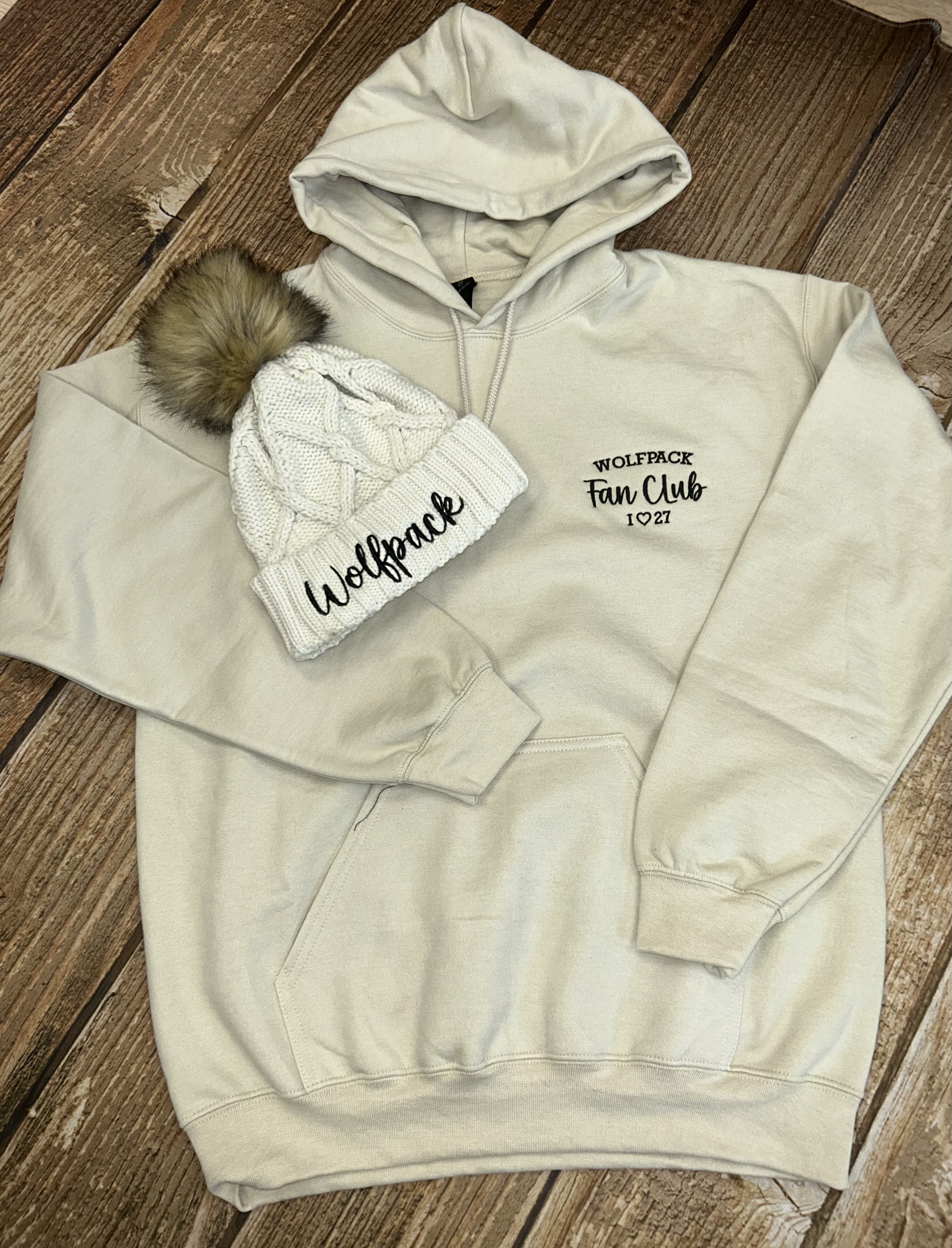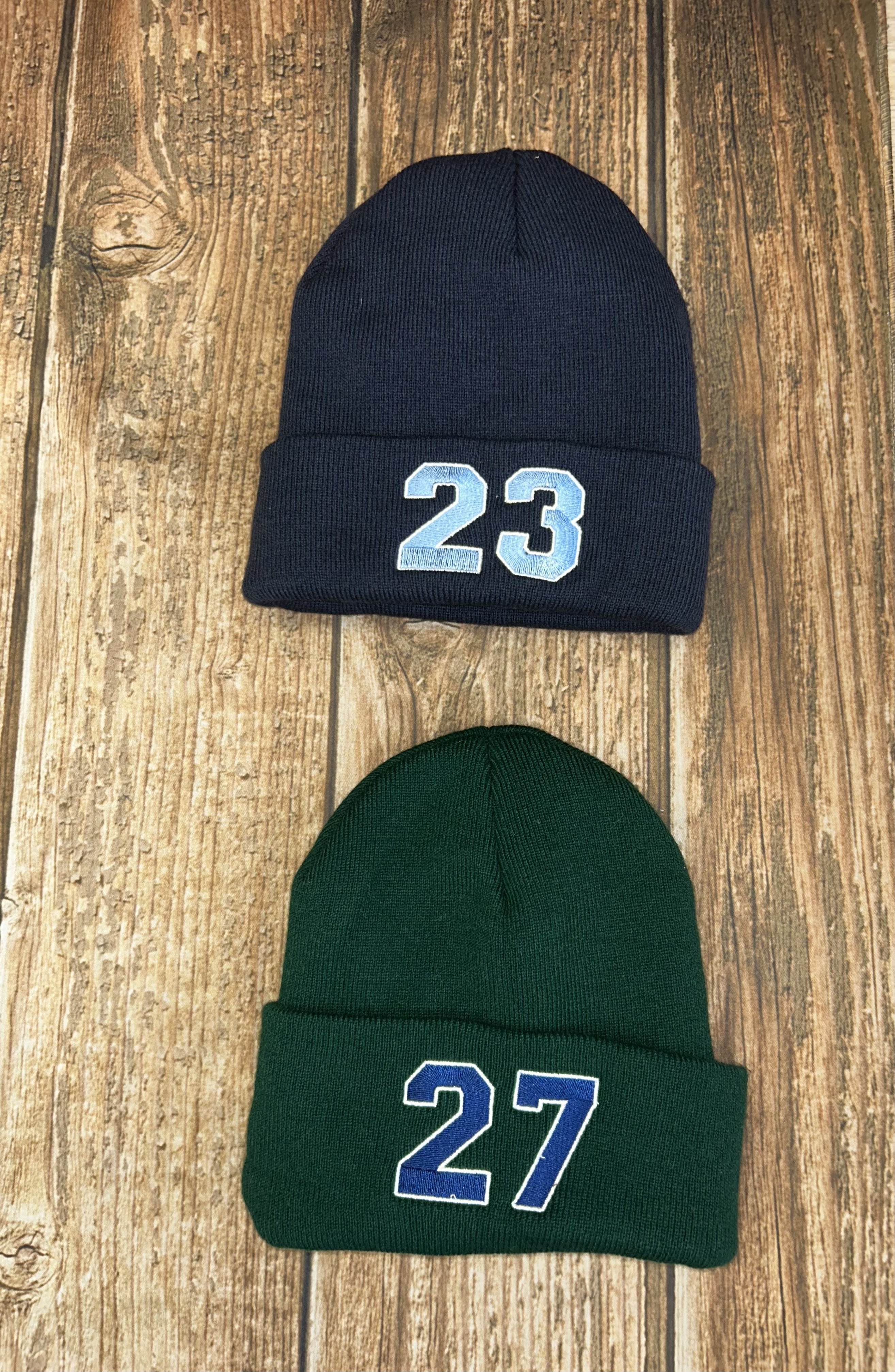 - The Varsity Beanie – Thick, on-trend, ribbed, with a clean cable-knit crown and an embroidered team name or favorite number on the cuff. Soft, warm, and perfect for adults and big kids.