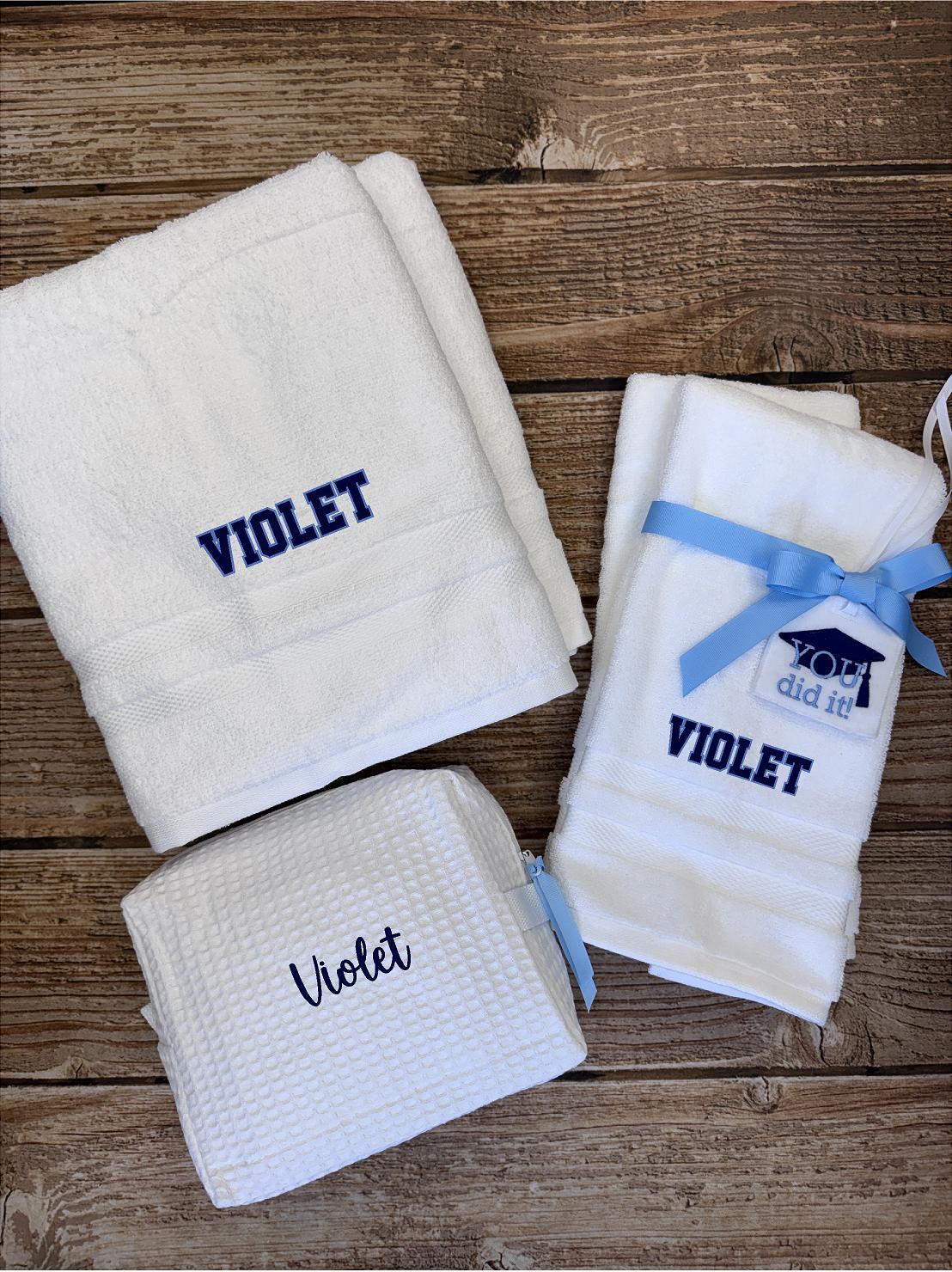 A personalized bath and hand towel embroidered with their name or monogram in school colors.